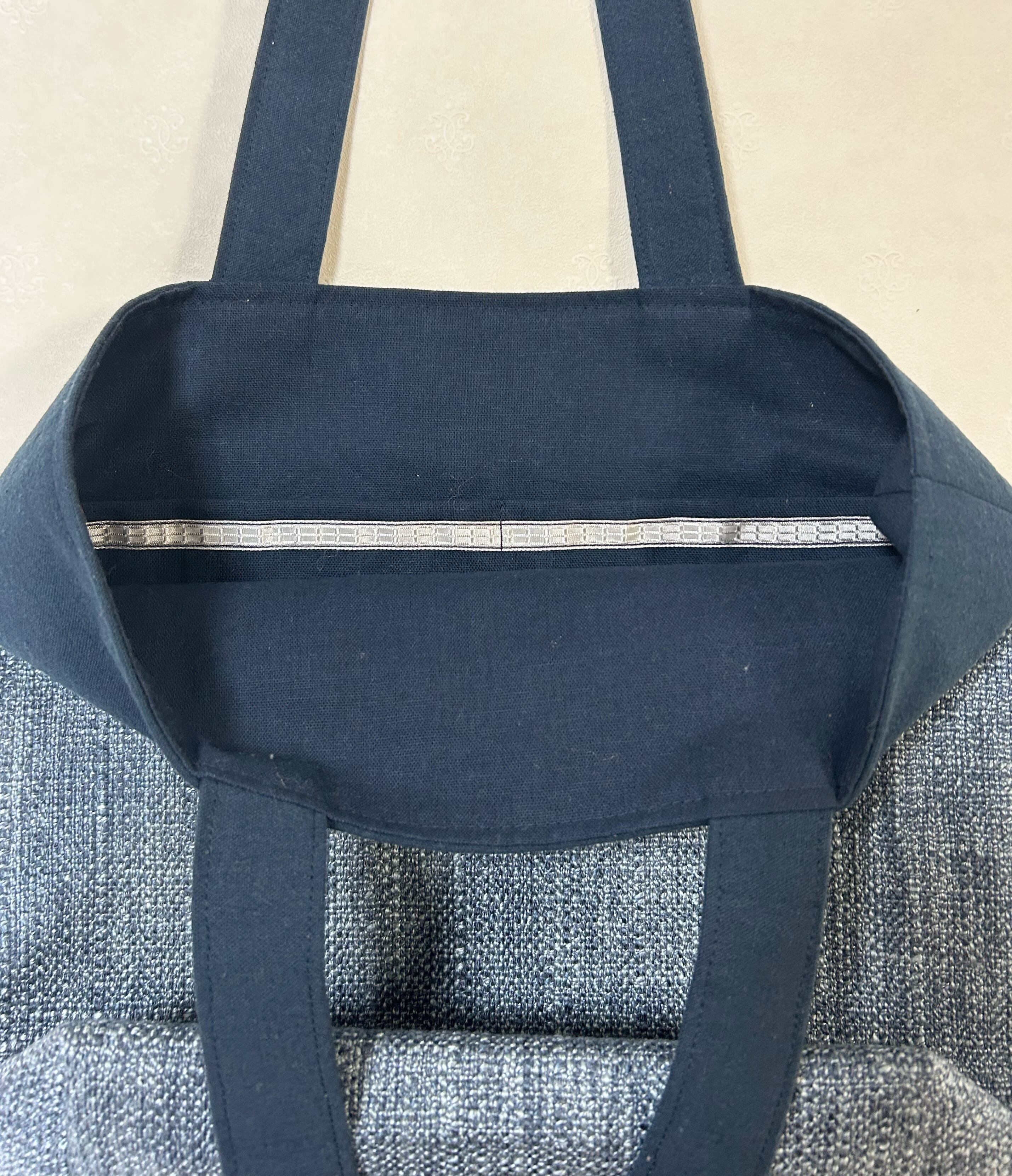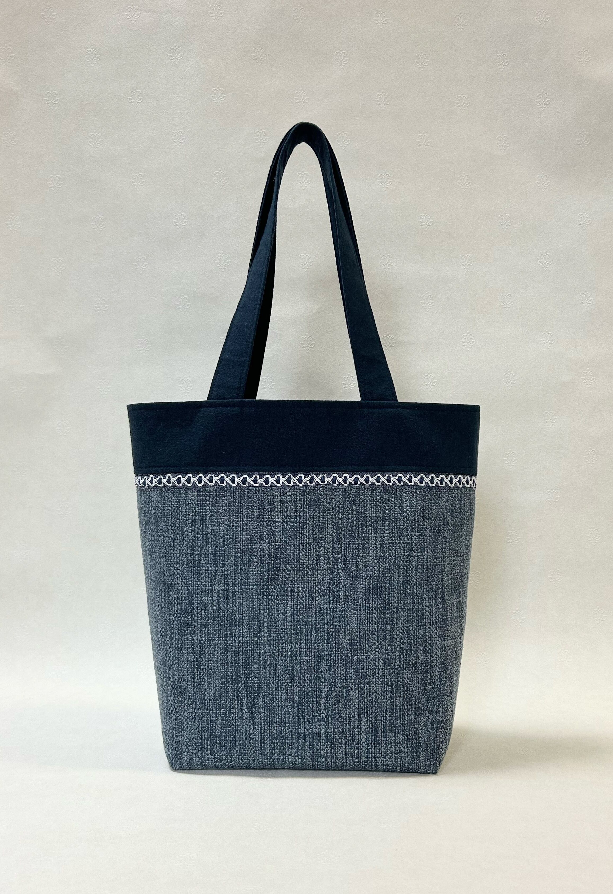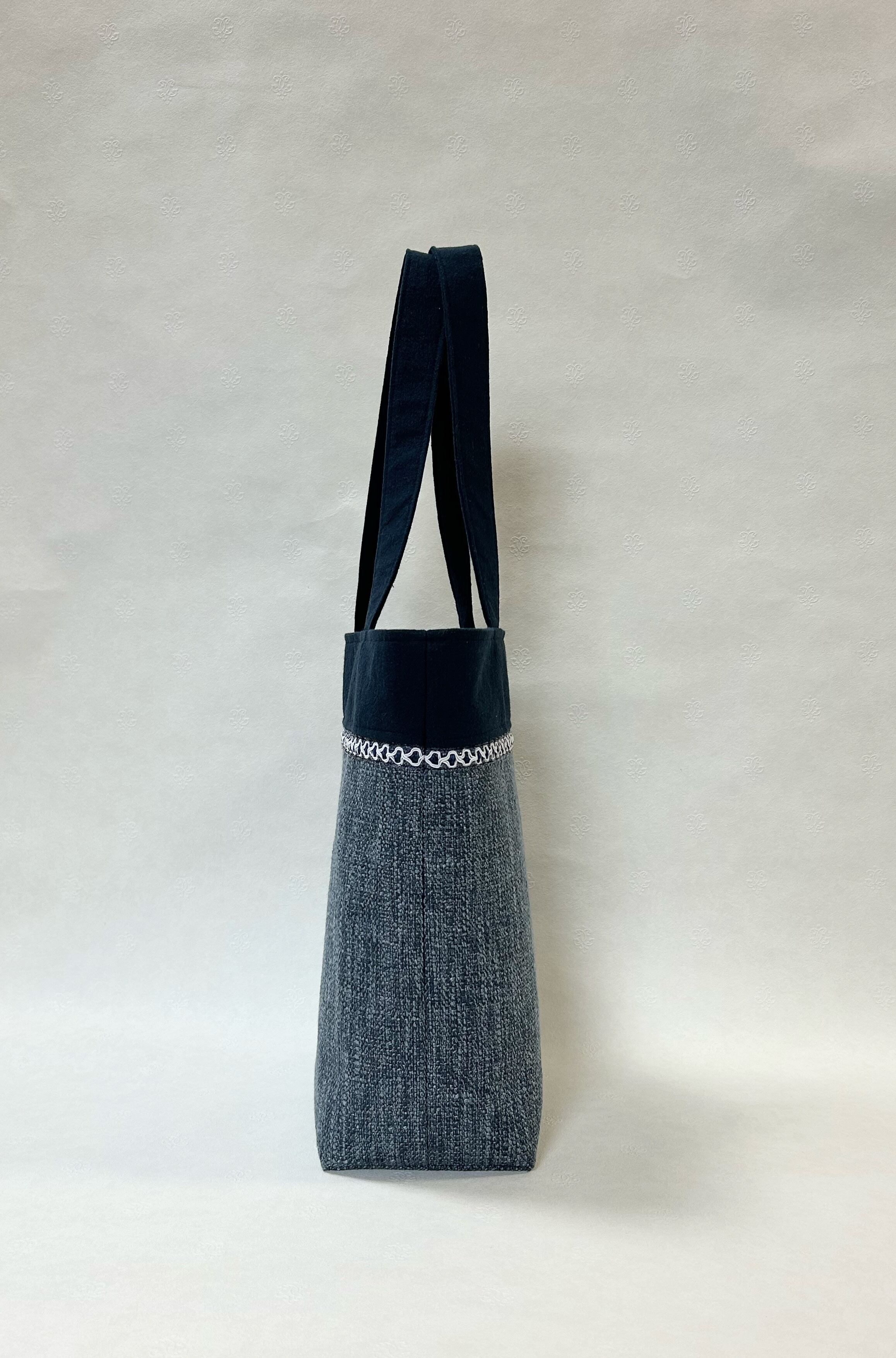 紺系ツイード生地でバック上部を別布で切り替えました。そこに紺白のブレードを施しシンプルでありながらオシャレなバックです。