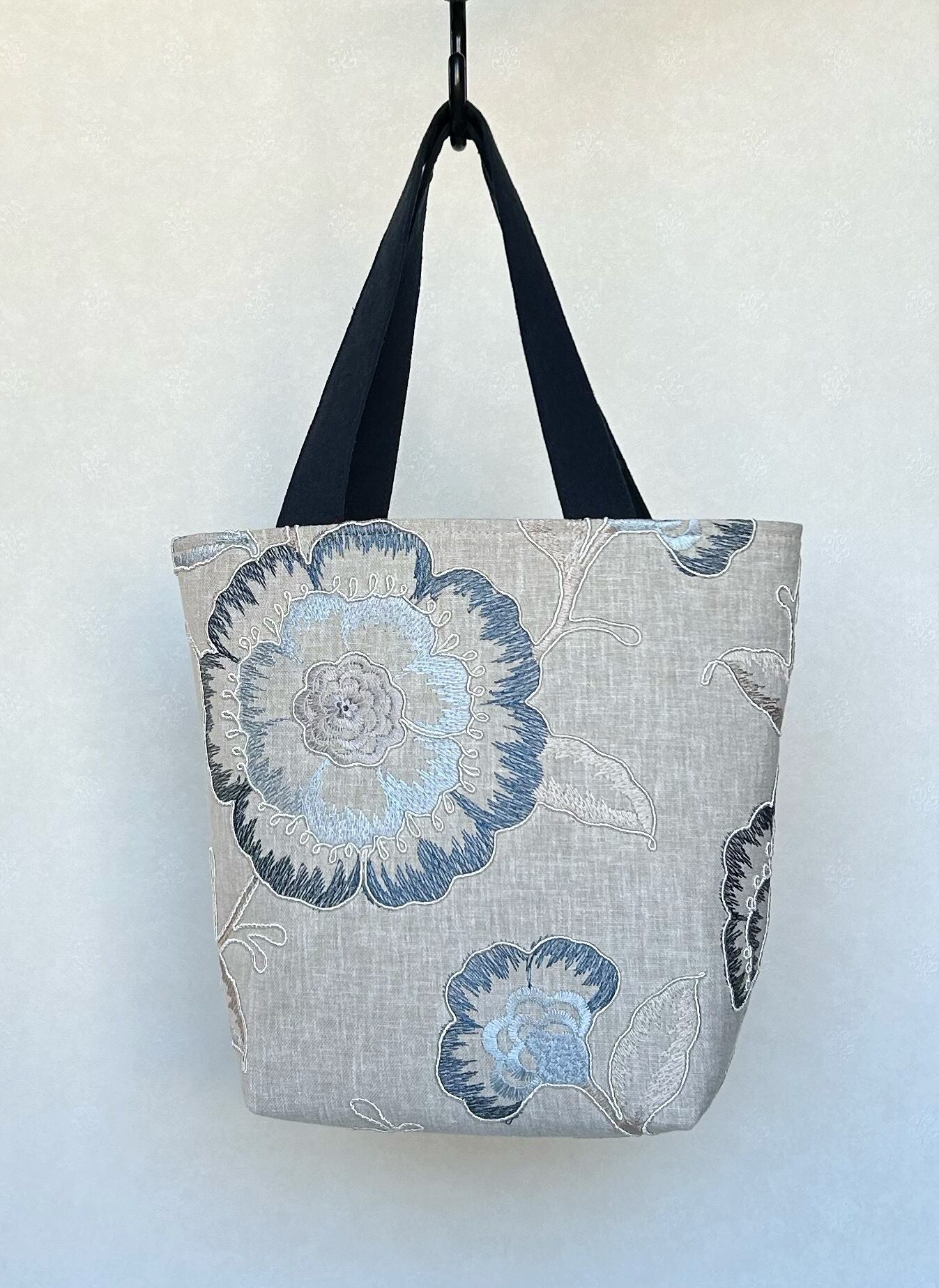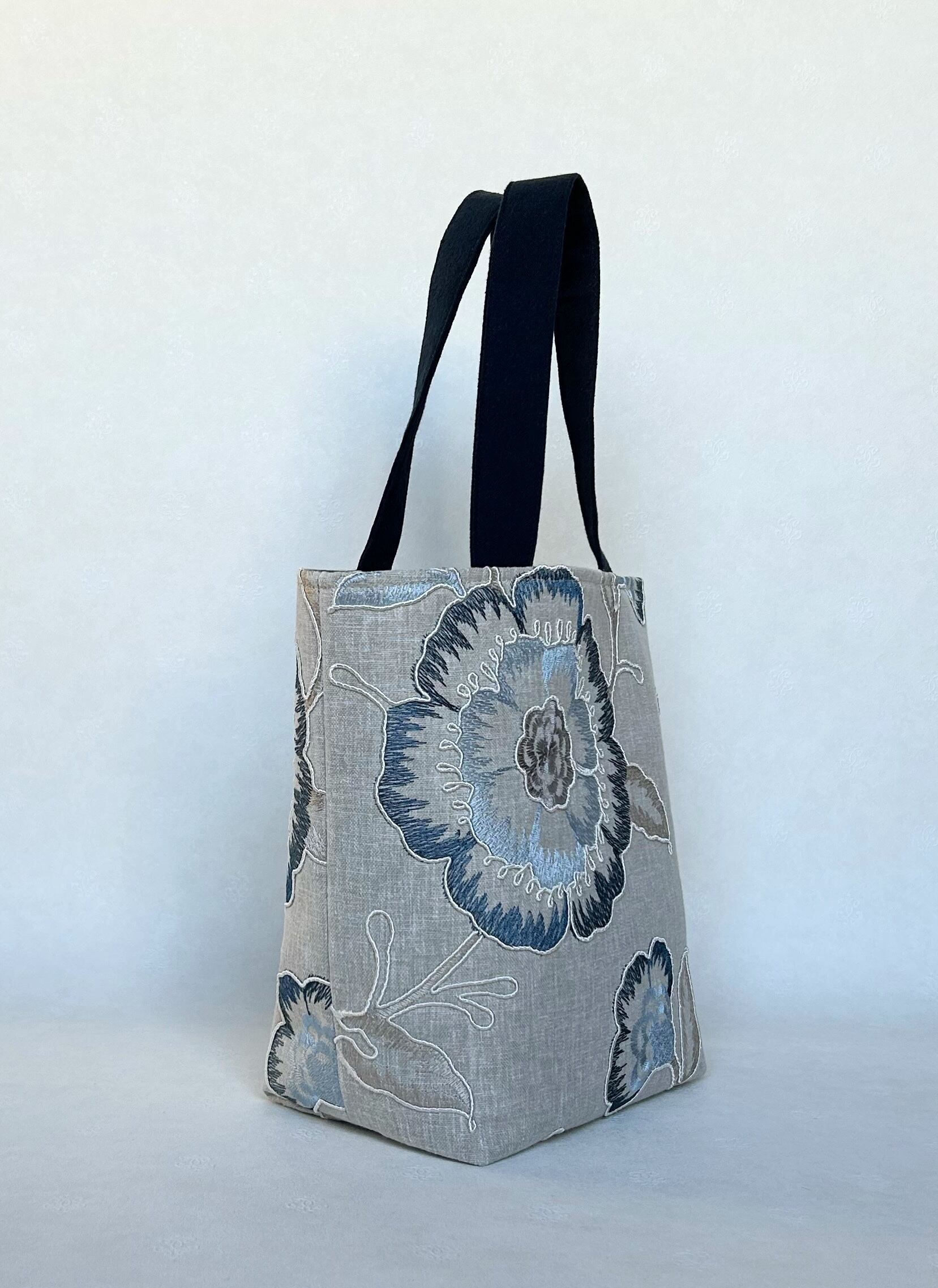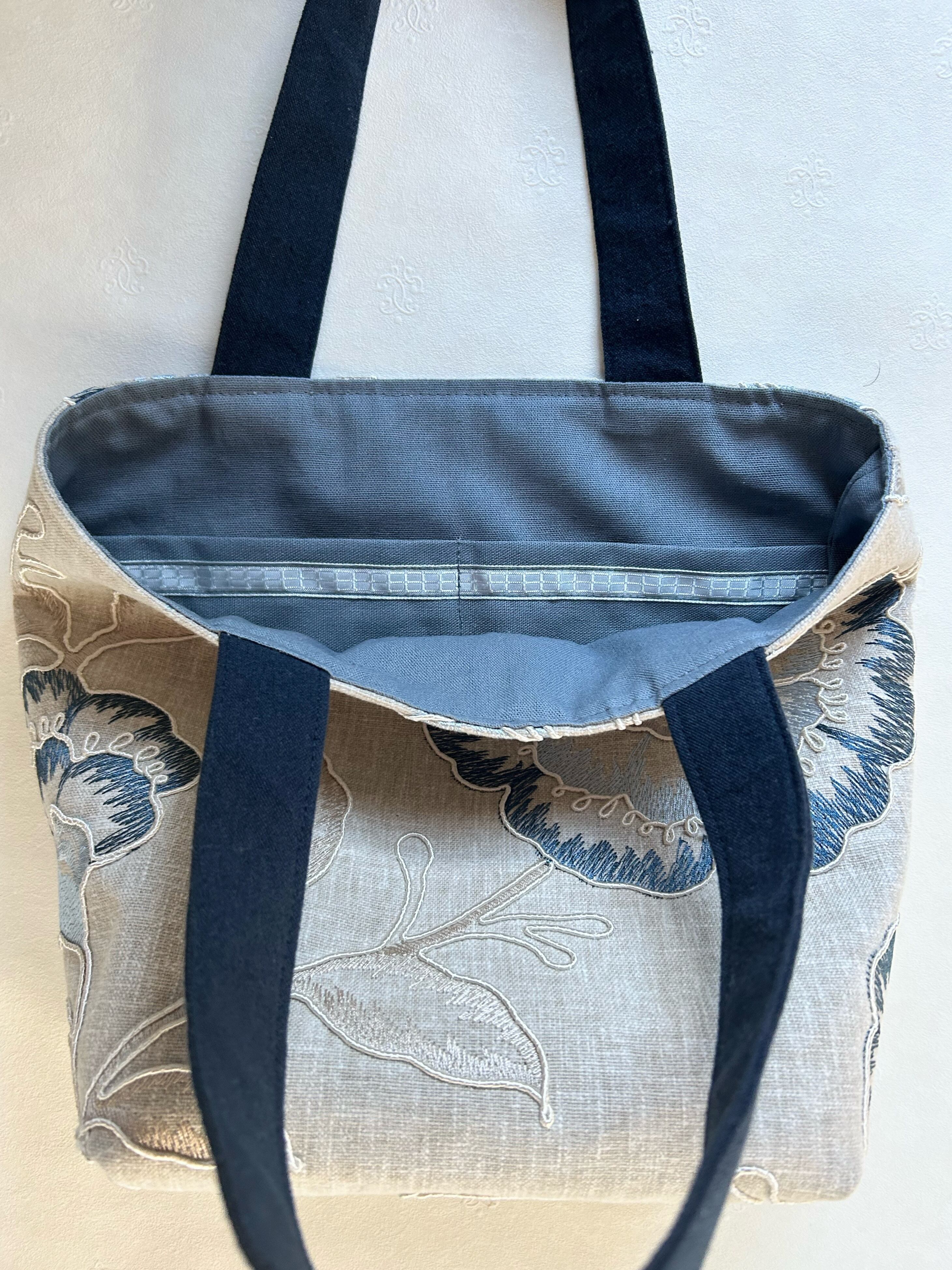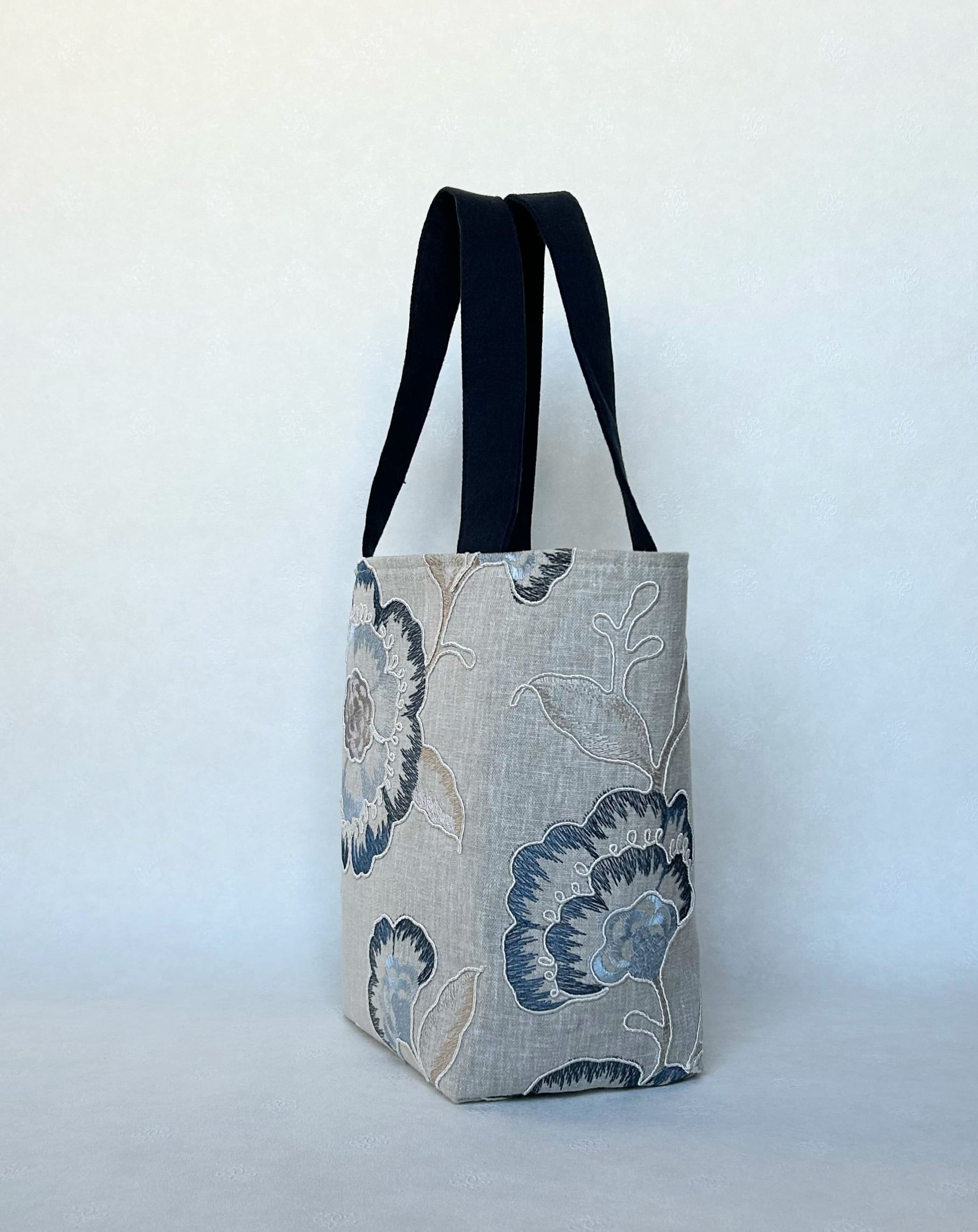 持ち手は厚手の綿麻生地に芯を貼り作っているのでしっかりしていて使いやすく刺繍の青色に合わせいるのでシックで落ち着いた雰囲気です。
